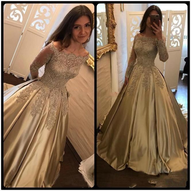 New Arrival Gold Ball Gown Prom Dresses Off Shoulder Long Sleeves