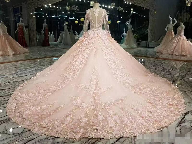 Ball Gown Prom Dresses Long Sleeve Lace Pink Floral Luxury Long