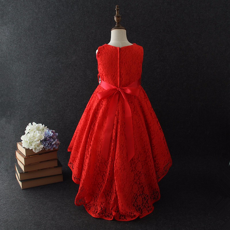 Fashion Kids Short Front Long Back Red Beautiful Lace Prom Dresses For