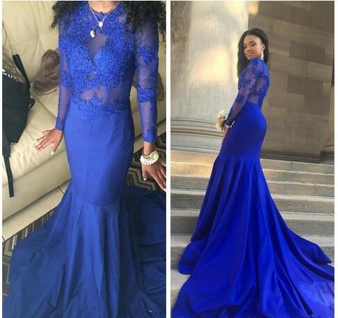 Mermaid Formal Evening Dresses Royal Blue Lace Appliques Sheer