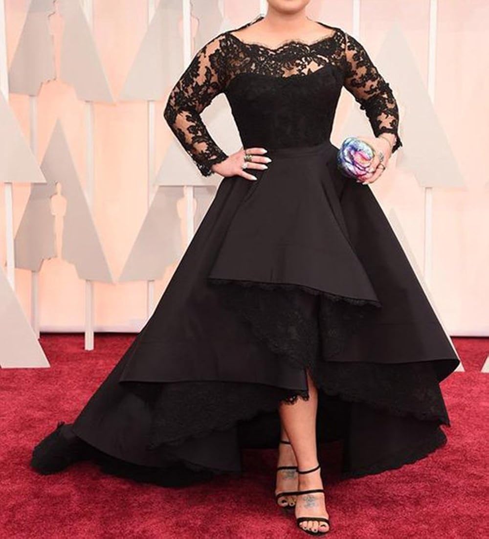 Black Long Sleeves Satin Plus Size Prom Dress With Lace Long Prom