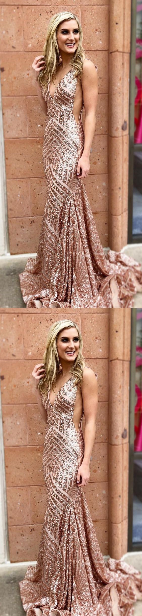 Rose Gold Sequin Plunging V Neck Mermaid Prom Dress Lunss
