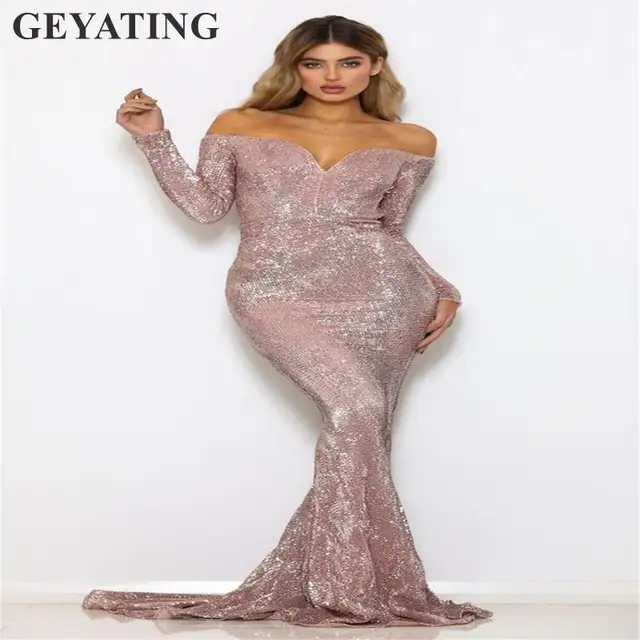 African Rose Gold Lace Sequin Mermaid Prom Dresses Long Sleeve Off