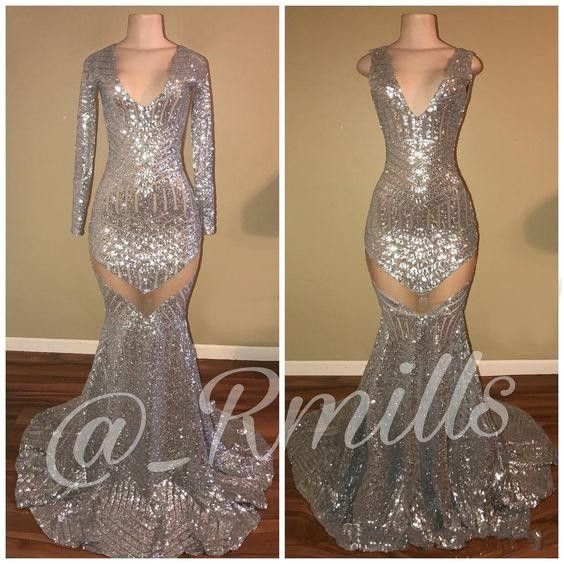 2019 New Rose Gold Silver Sequined Lace Mermaid Prom Dresses V