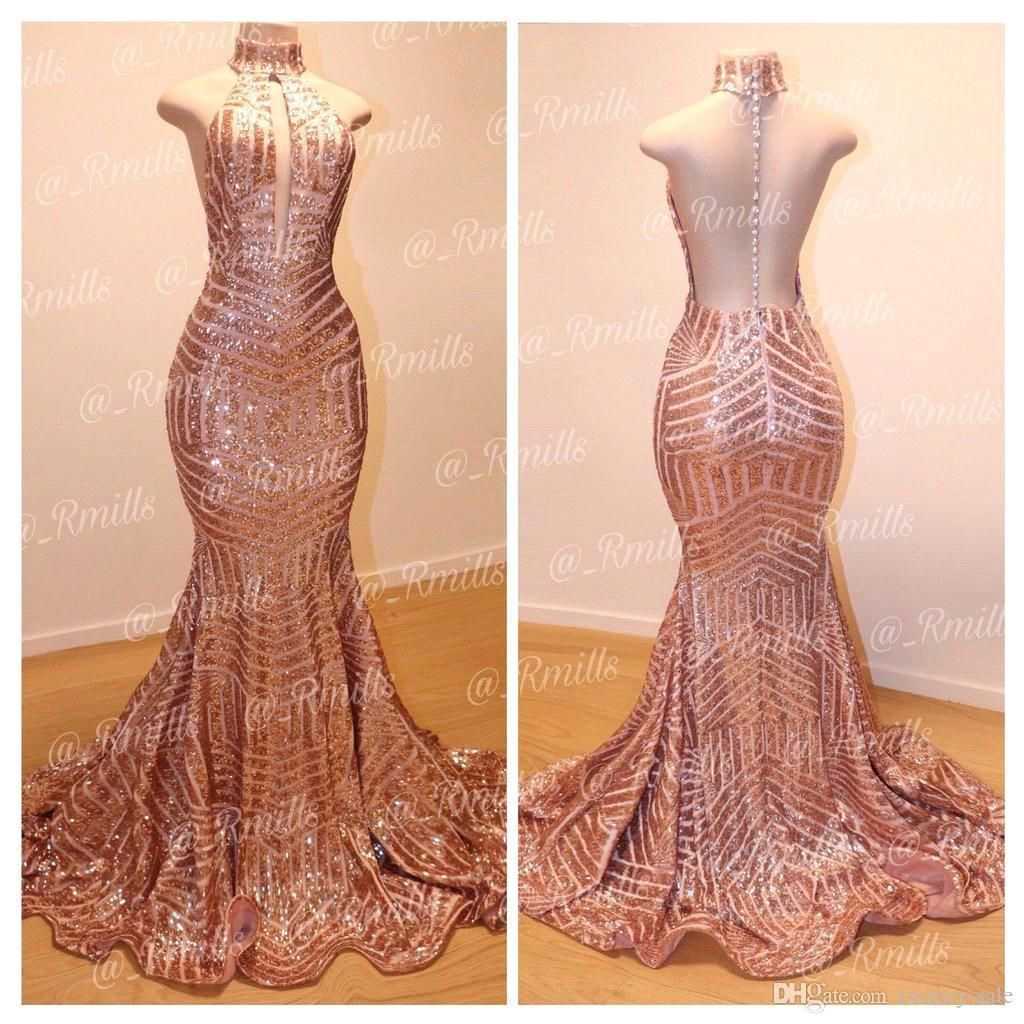 Rose Gold Sequin High Neck Backless Mermaid Prom Gown Long