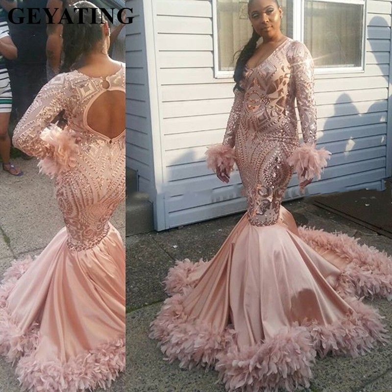 Sparkly Rose Gold Mermaid Feather Prom Dresses Long Sleeve Open