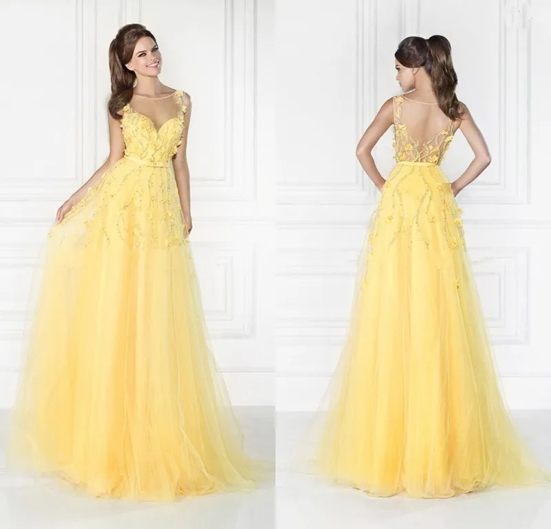 2015 Stunning Beautiful Long Yellow Prom Dresses High Neck Tulle