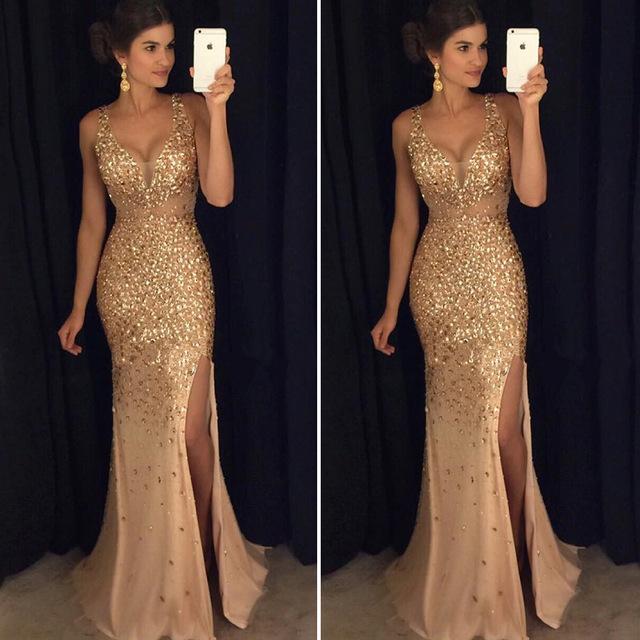 Shimmery Long V Neck Prom Dress With Slit Ever Pretty Us
