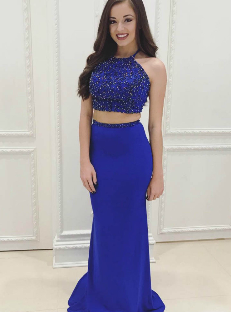 Xcos 2018 New Two Piece Prom Dresses Long Royal Blue Beaded Halter