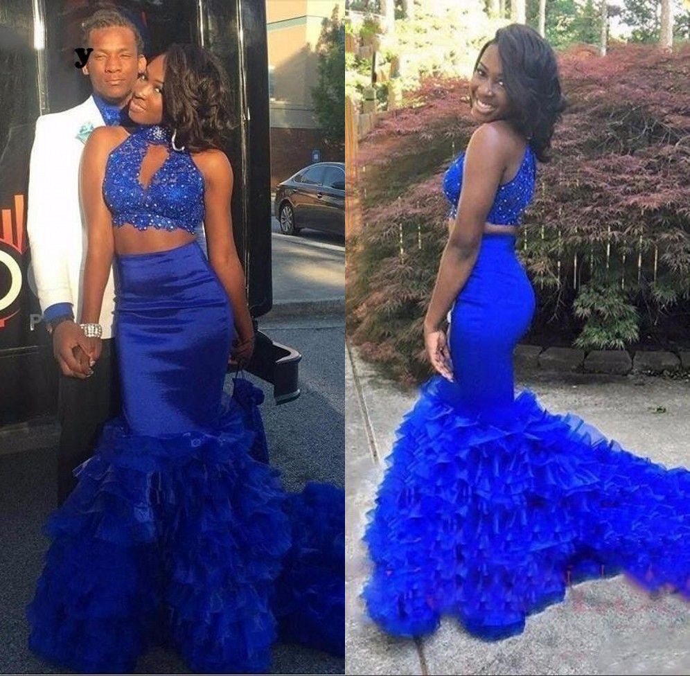 High Neck Royal Blue Two Piece Mermaid Prom Gown With Beaded Top