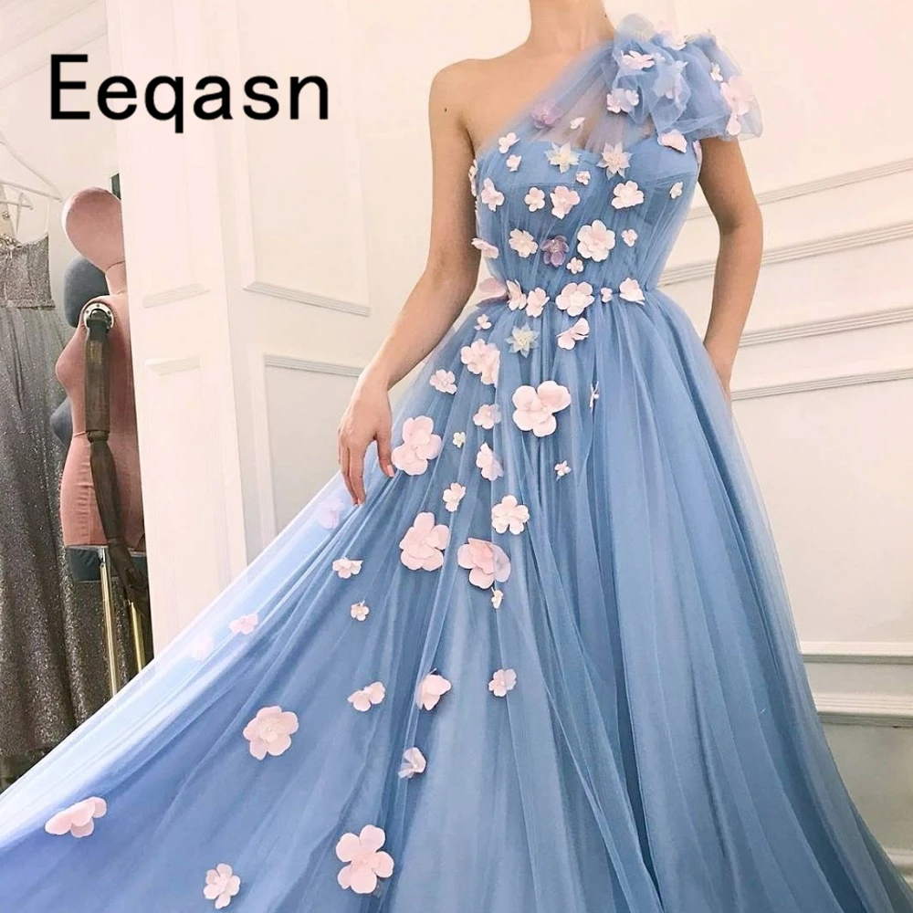 Elegant Blue Long Prom Dresses One Shoulder A Line White Flowers