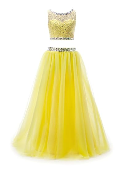 Two Piece Prom Dresses A Line Rhinestone Yellow Long Sparkly Prom