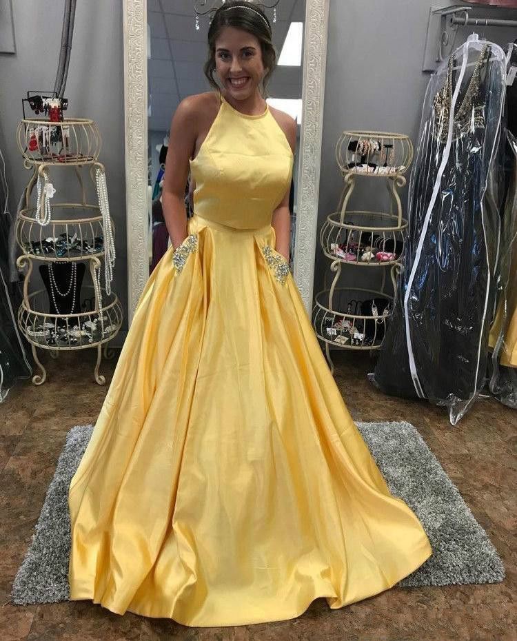 Elegant Two Piece Halter Yellow Long Prom Dress With Pockets On Luulla
