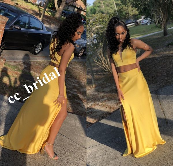 New Two Piece Yellow Prom Dresses 2019 Open Back Evening Party