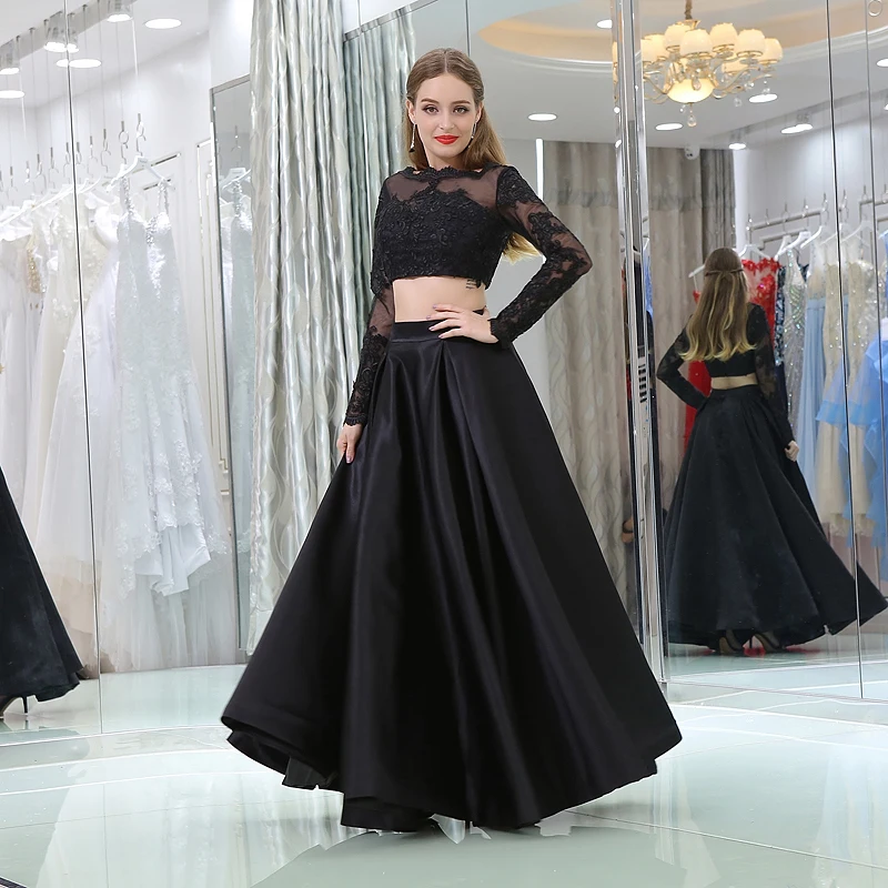 Black Prom Dress Prom Gown Long Sleeves Prom Dress Two Piece Prom