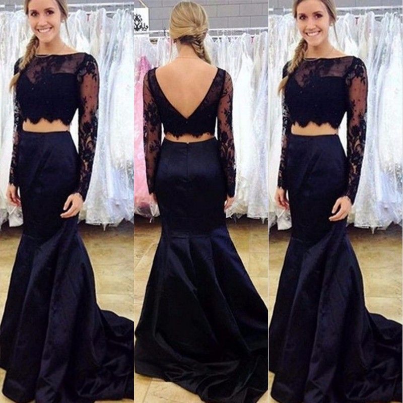 2017 Black Two Piece Mermaid Prom Dress Backless Lace Long Sleeves