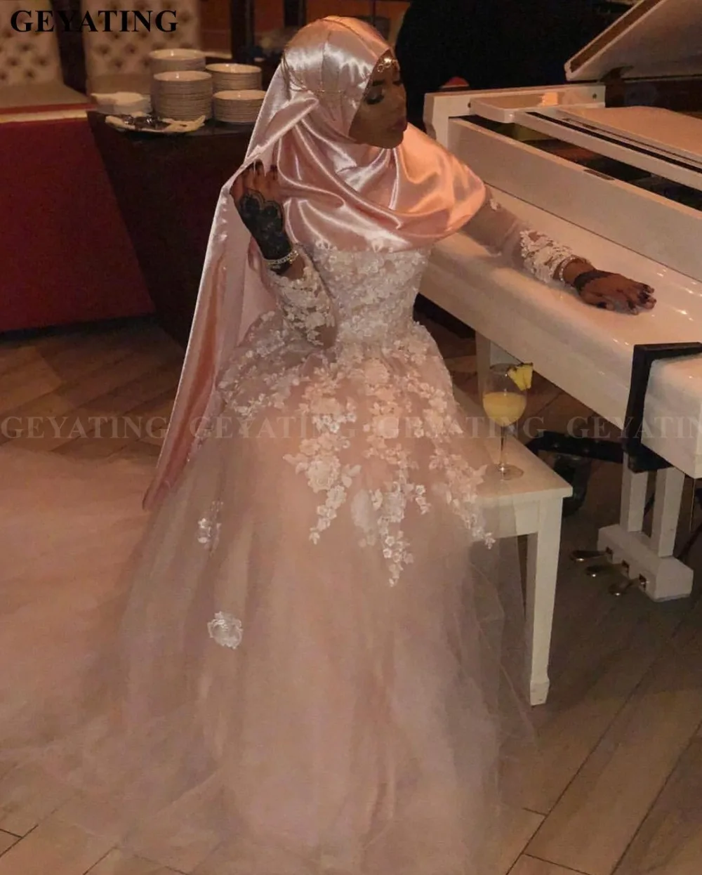 Long Sleeve Blush Dress With Hijab Dress With Train Muslim Prom