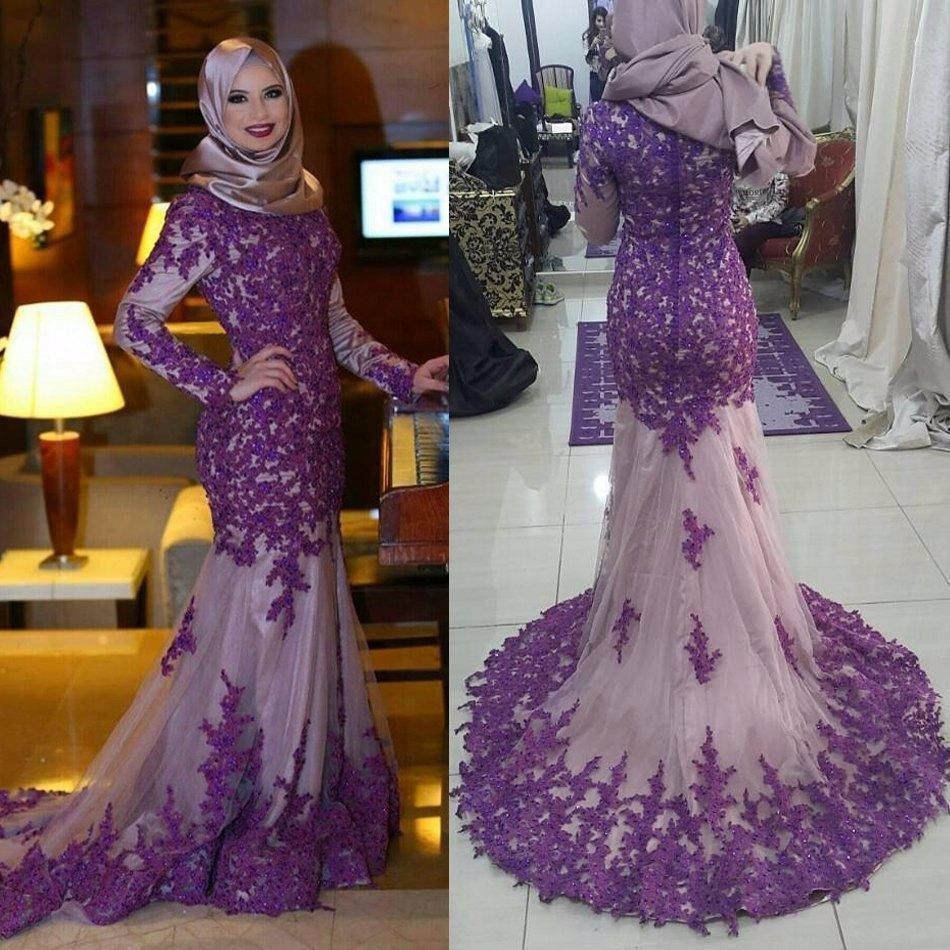 Gorgeous Mermaid Muslim Dress Purple Long Sleeve Lace Prom Dresses