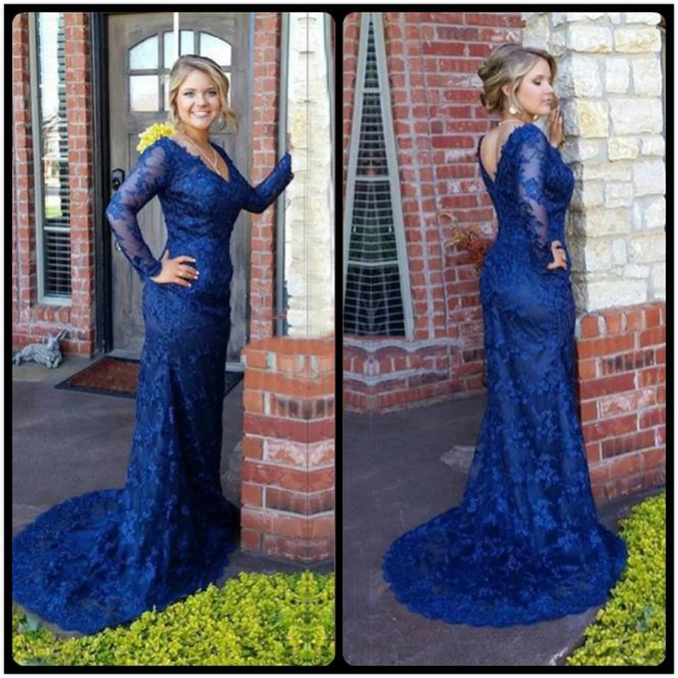 Dark Blue Mermaid Long Sleeve Lace Appliques Prom Dress Plus Size