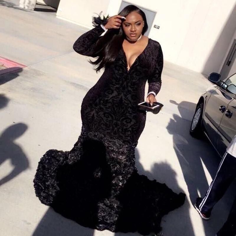 3d Rose Floral Black Girls Plus Size Prom Dresses 2019 Long Sleeve