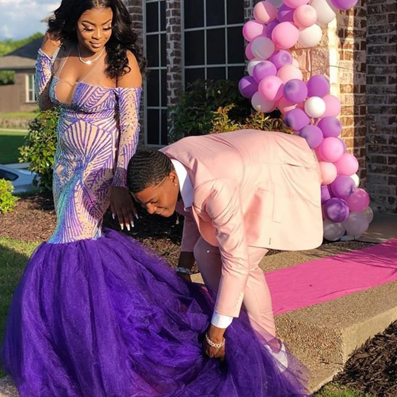 African Sparkle Sequin Mermaid Purple Prom Dresses Long Sleeves