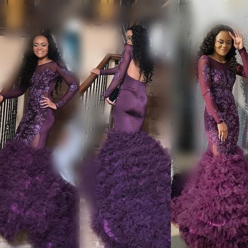 Long Purple Mermaid Prom Dresses Long Sleeves Appliques Ruffles