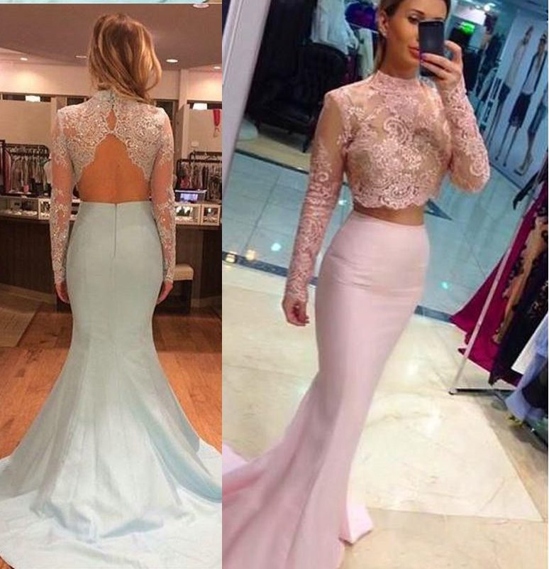 2016 Two Piece Mermaid Prom Dresses High Neck Long Sleeves Lace