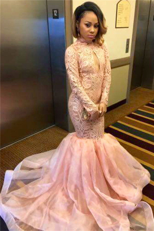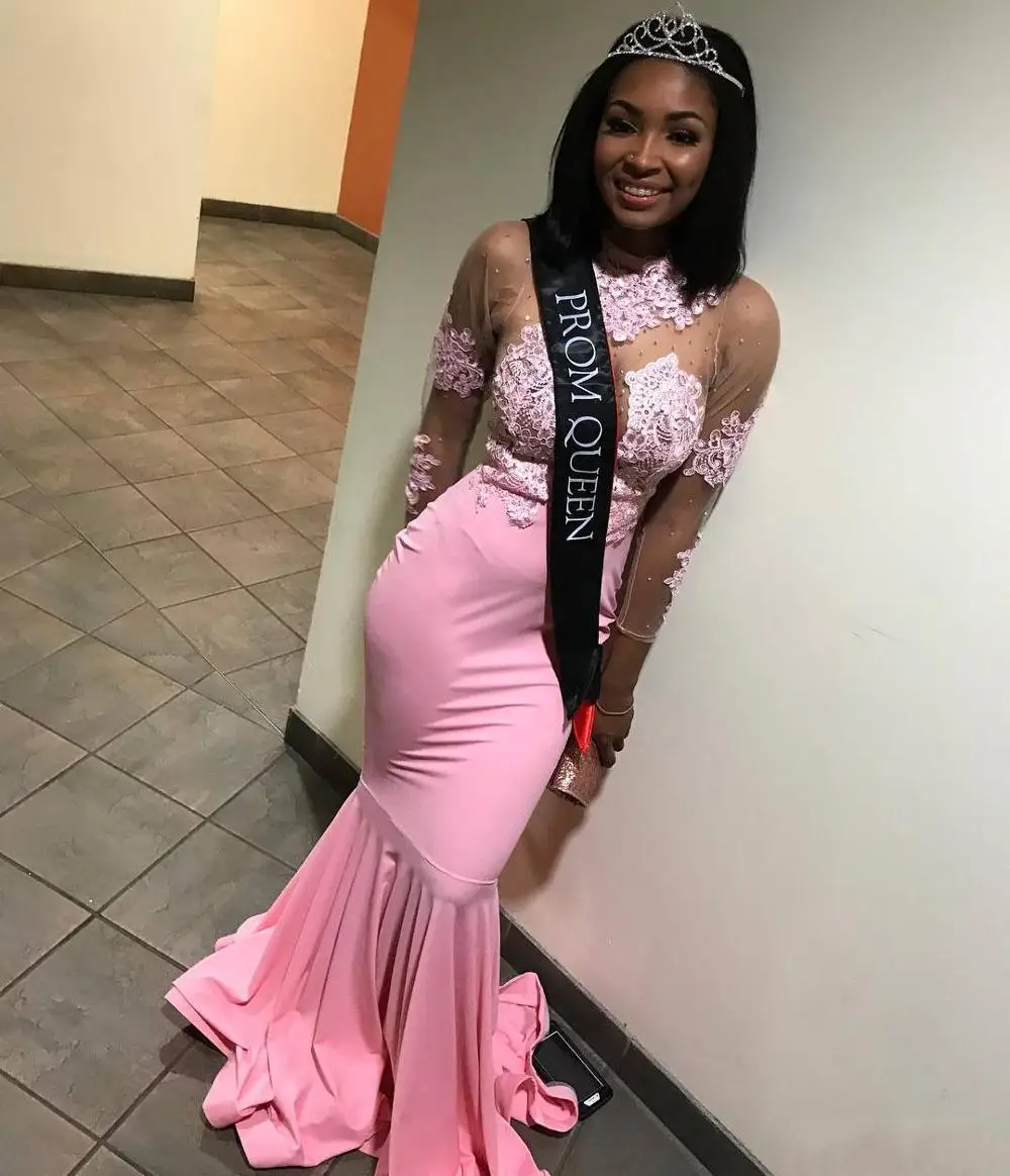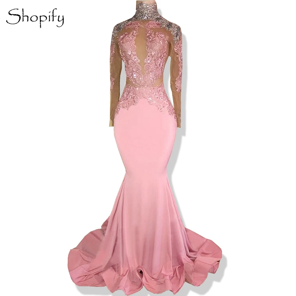 Black Girls Long Sleeve Mermaid Pink Prom Dresses 2020 High Neck