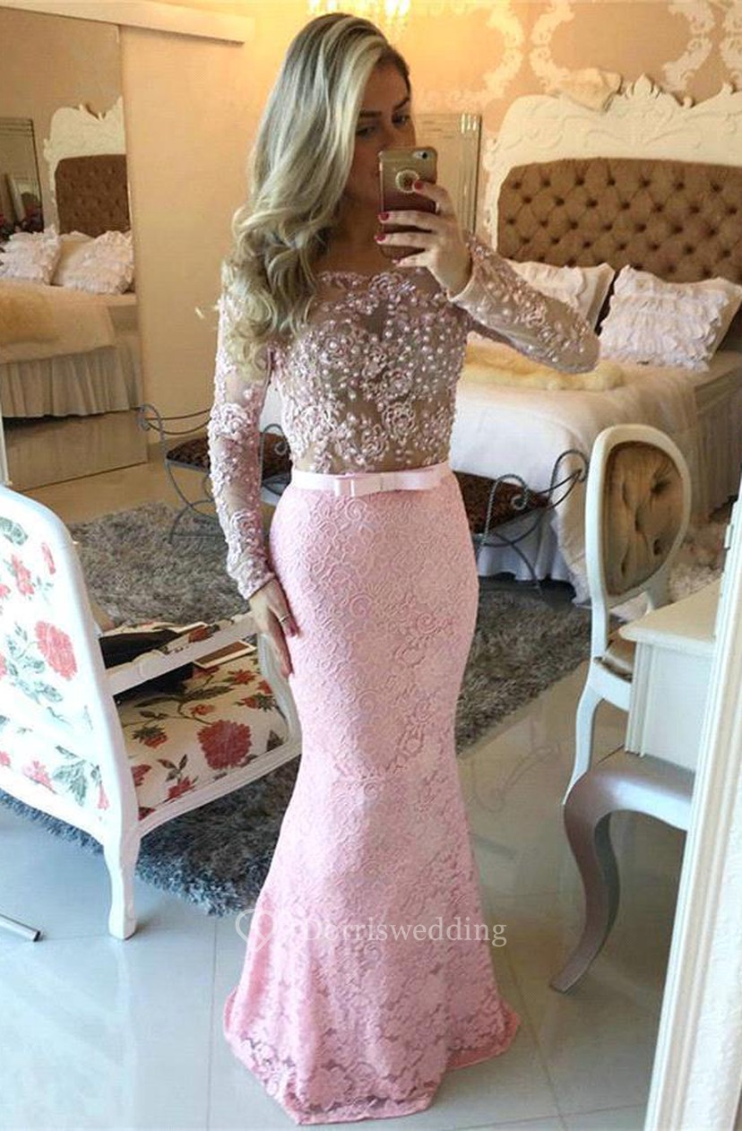 Pink Long Sleeve Lace Prom Dresses Ficts