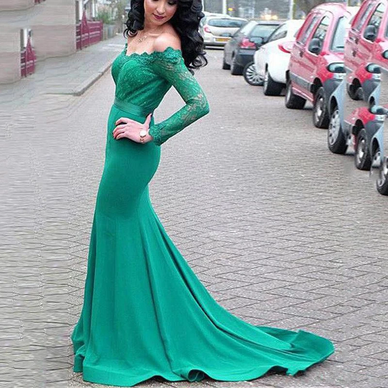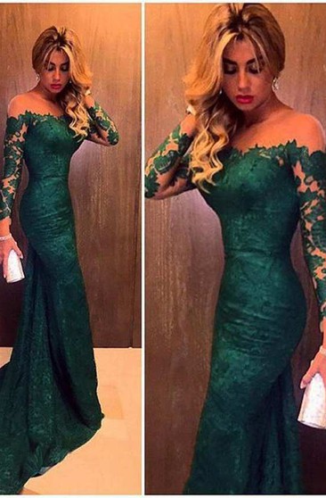 Green Mermaid Prom Dress 2019 Off Shoulder Illusion Long Sleeve