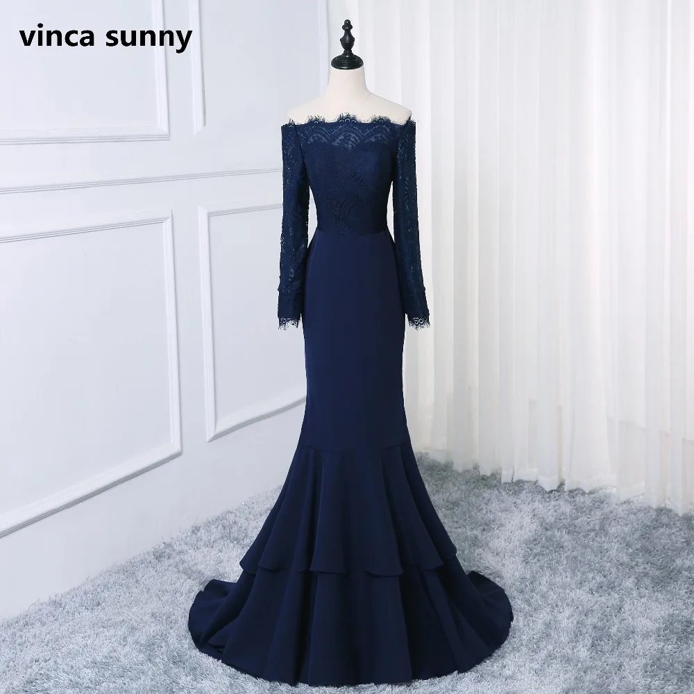 Navy Blue Off Shoulder Mermaid Prom Dress Formal Gowns Long Lace
