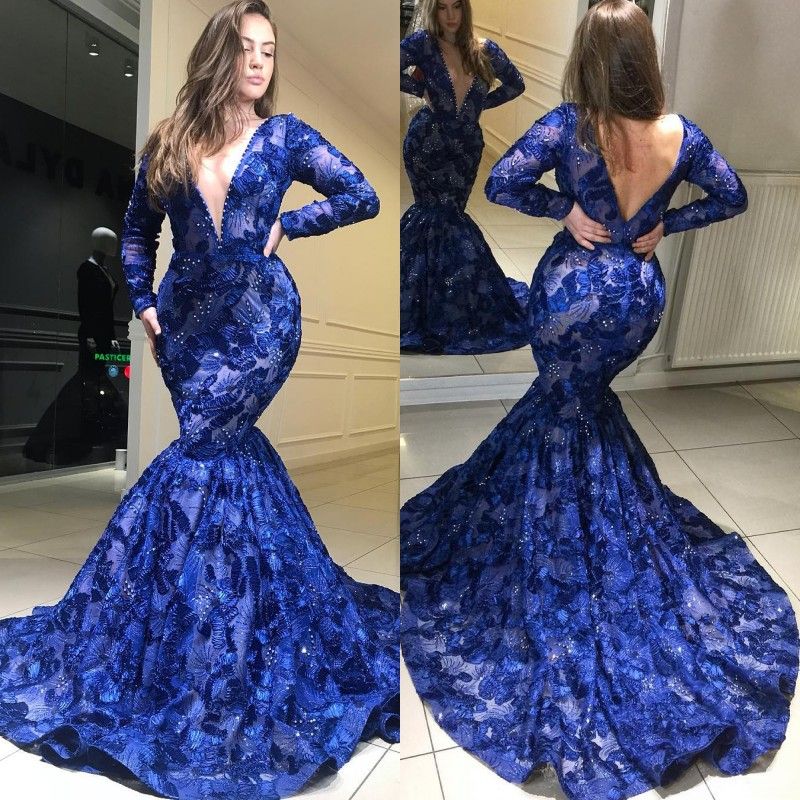 Royal Blue Lace Prom Dresses Sexy Dubai Deep V Neck Long Sleeve