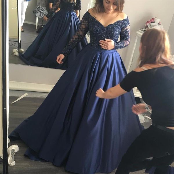 Navy Blue Prom Dresses Ball Gowns Off The Shoulder Long Sleeve