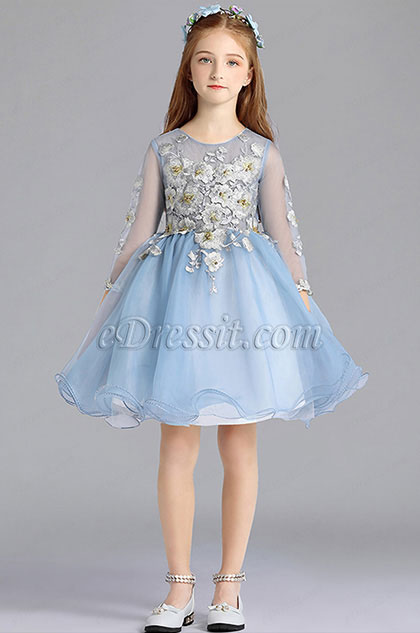 Edressit Blue Long Sleeves Cute Wedding Flower Girl Party Dress