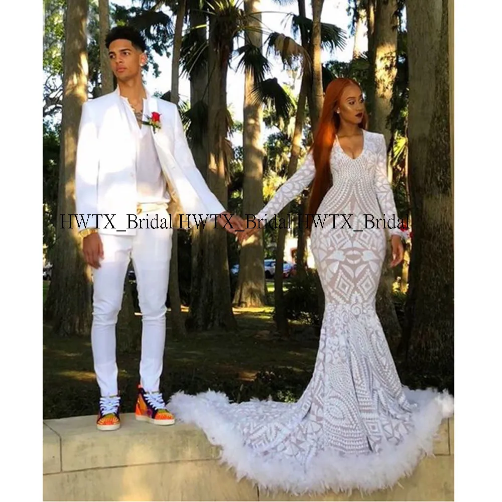 Luxury Feathers African 2020 Prom Dresses With Long Sleeves V Neck