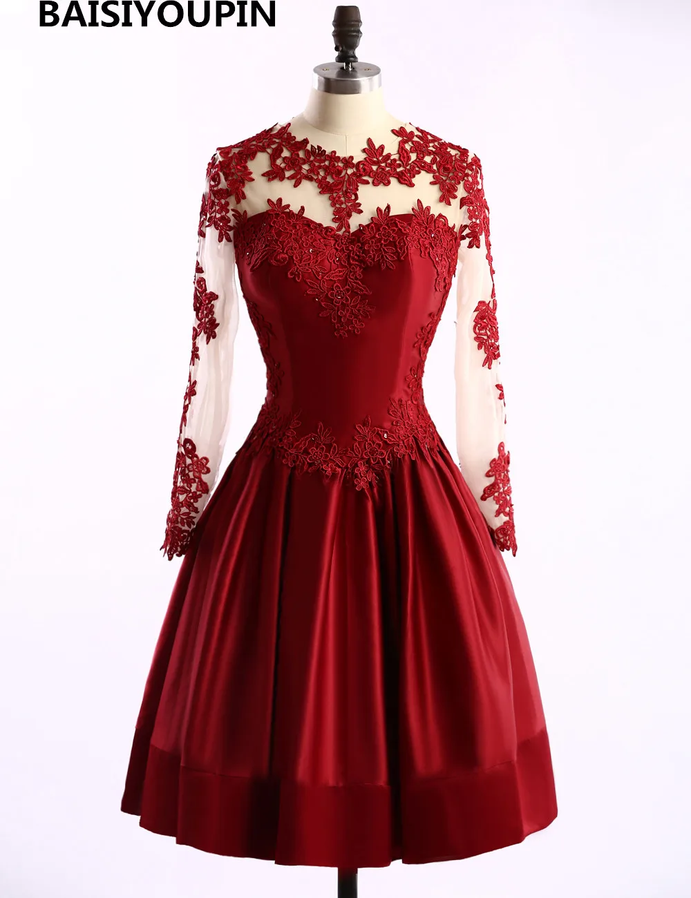 Long Sleeve Lace Short Homecoming Dresses Burgundy Mini Women Plus