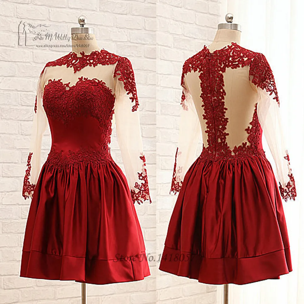 Scoop Neck See Though Lace Short Prom Dress Long Sleeved Red