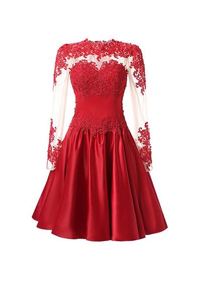 Red Lace Long Sleeve Short Prom Dress Homecoming Dress Shdress