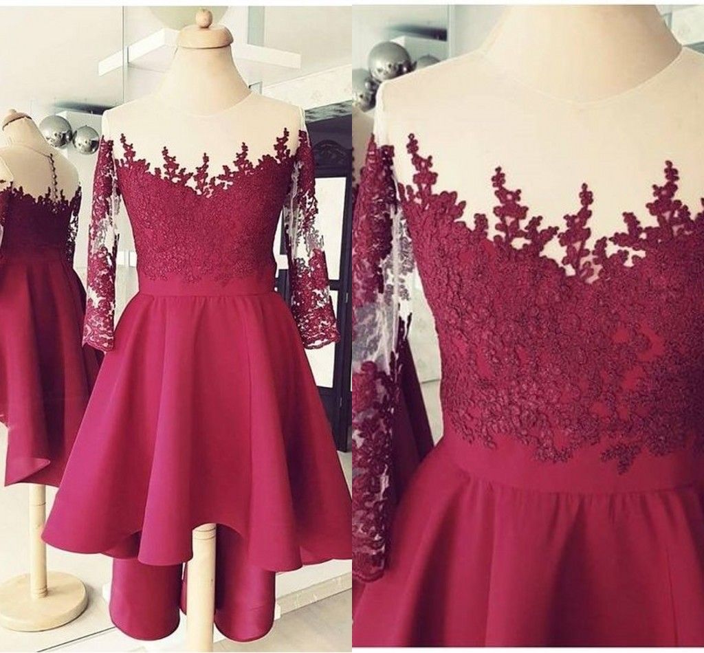 Hi Lo Long Sleeve Short Prom Dresses Cheap Burgundy Lace Satin