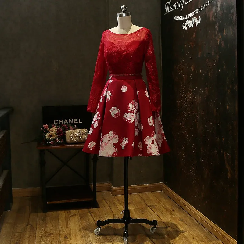2016 New Arrival Short Red Lace Prom Dress Long Sleeve Modest Two