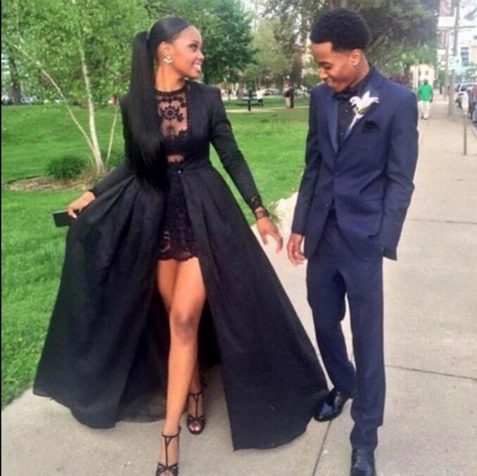 P84 Sexy Two Piece Prom Dresses Black Lace Short Prom Dresses Long