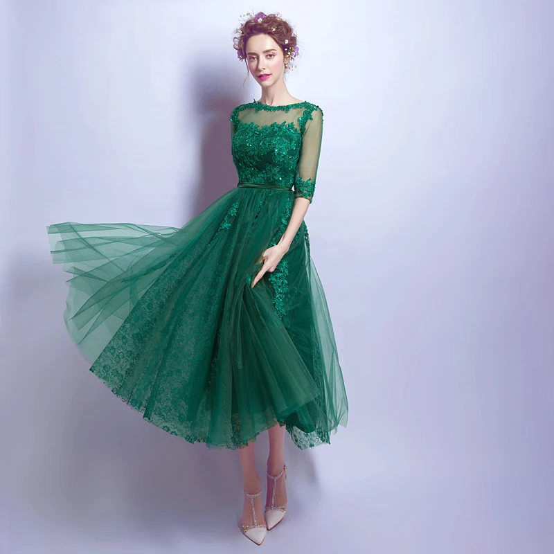 Emerald Green Prom Dress Tea Length 2019 Sheer Half Long Sleeve