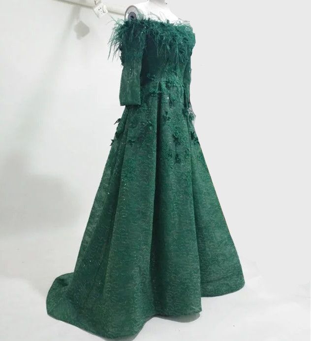 Emerald Green Prom Dresses Long Sleeves Feather Off Shoulder Lace