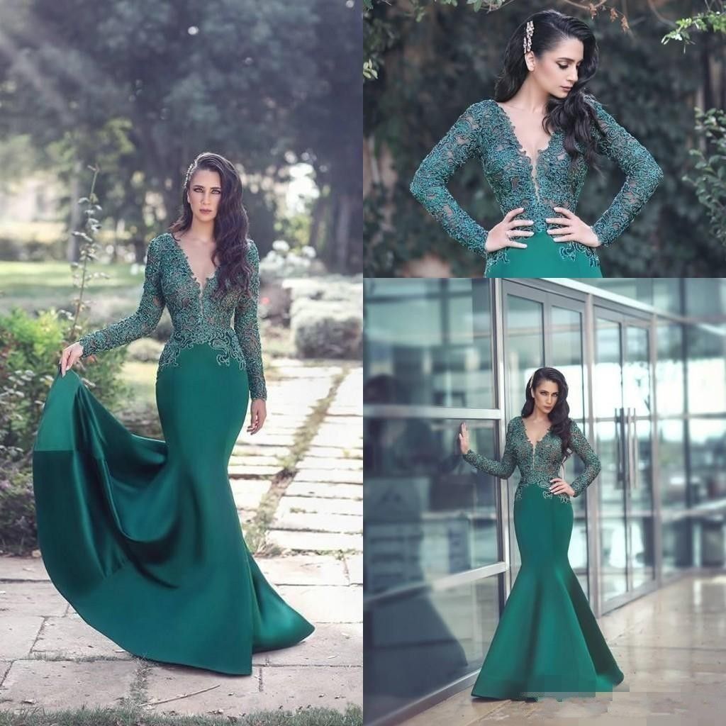 Emerald Green Long Prom Dresses Evening Wear 2019 Long Sleeve Lace