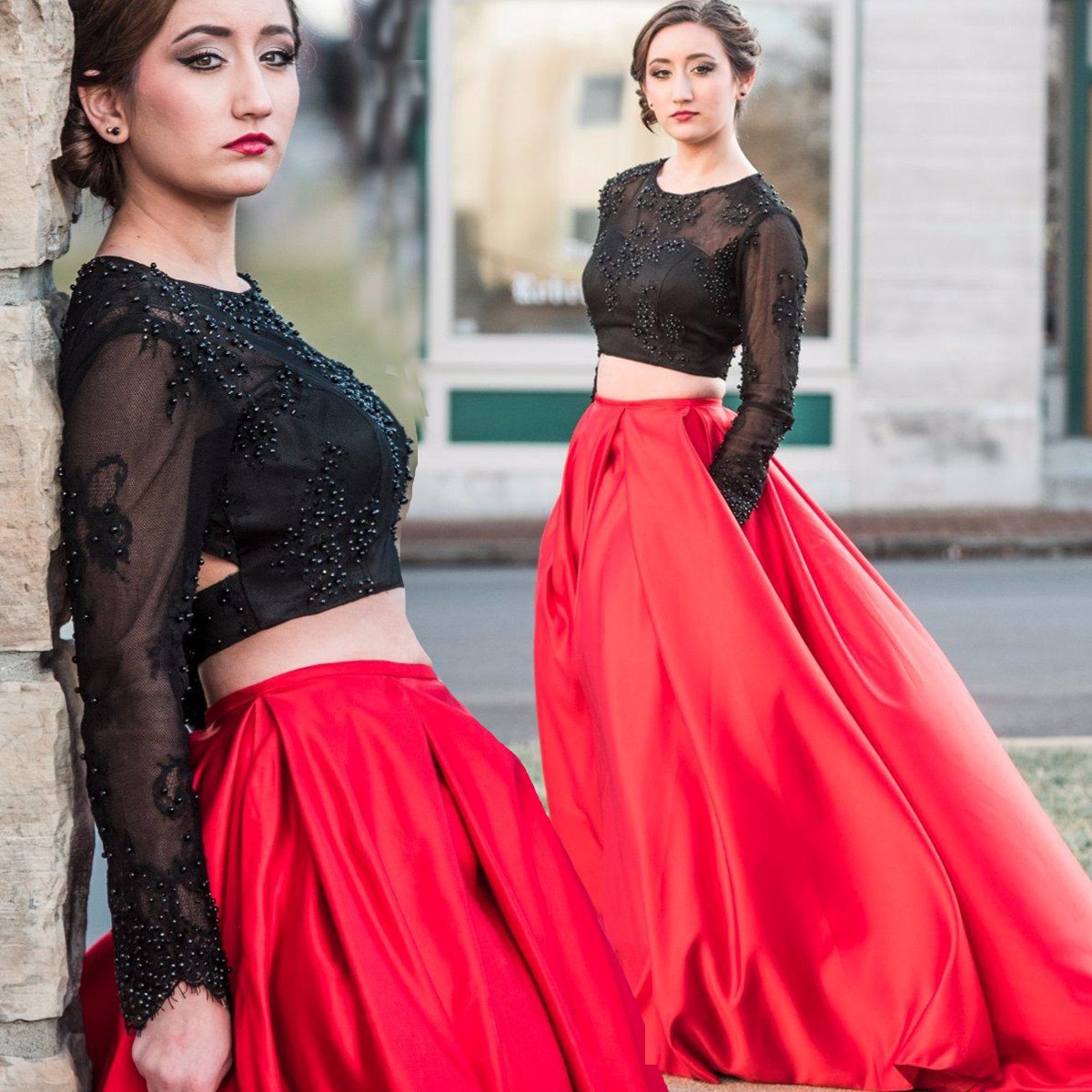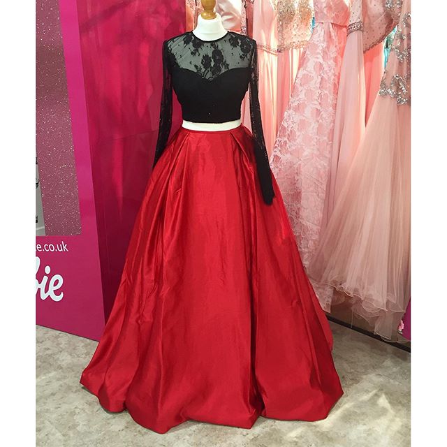 Black Long Sleeved Top Red Bottom Two Piece Prom Dress 2018