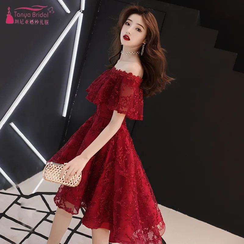 Half Sleeves Short Front Long Back Prom Dresses Red Black White Hi