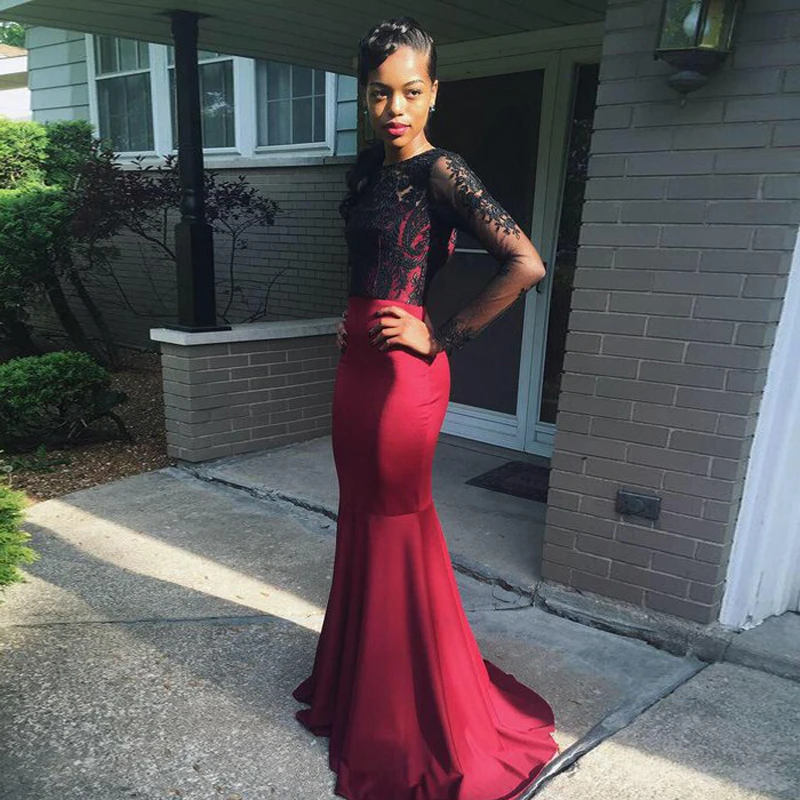 Elegant Black Burgundy Mermaid Long Sleeves Lace Prom Dress Lace