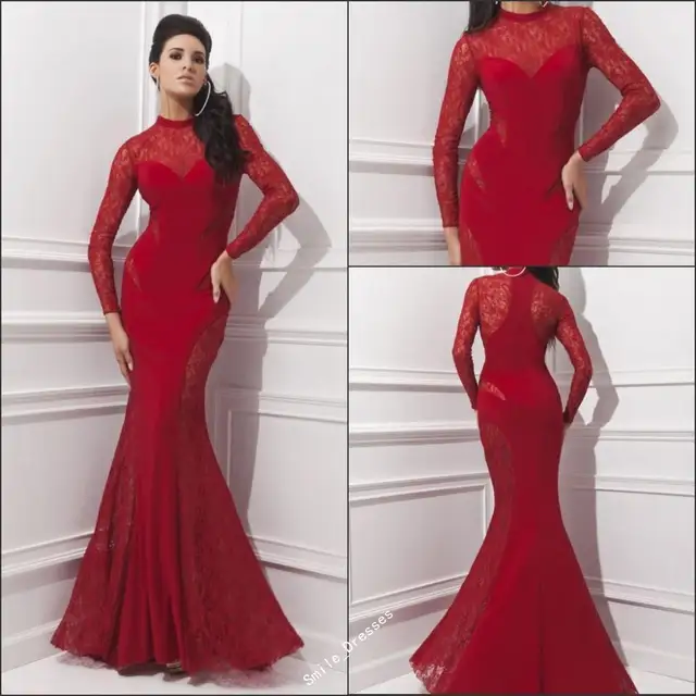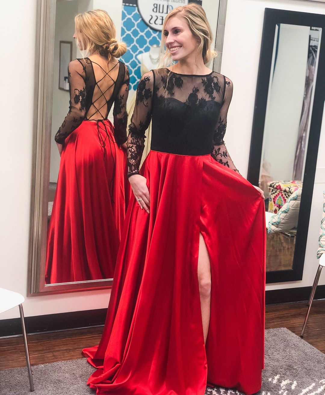 Red Black Lace Satin Sheer Long Sleeve Prom Dress Promfy