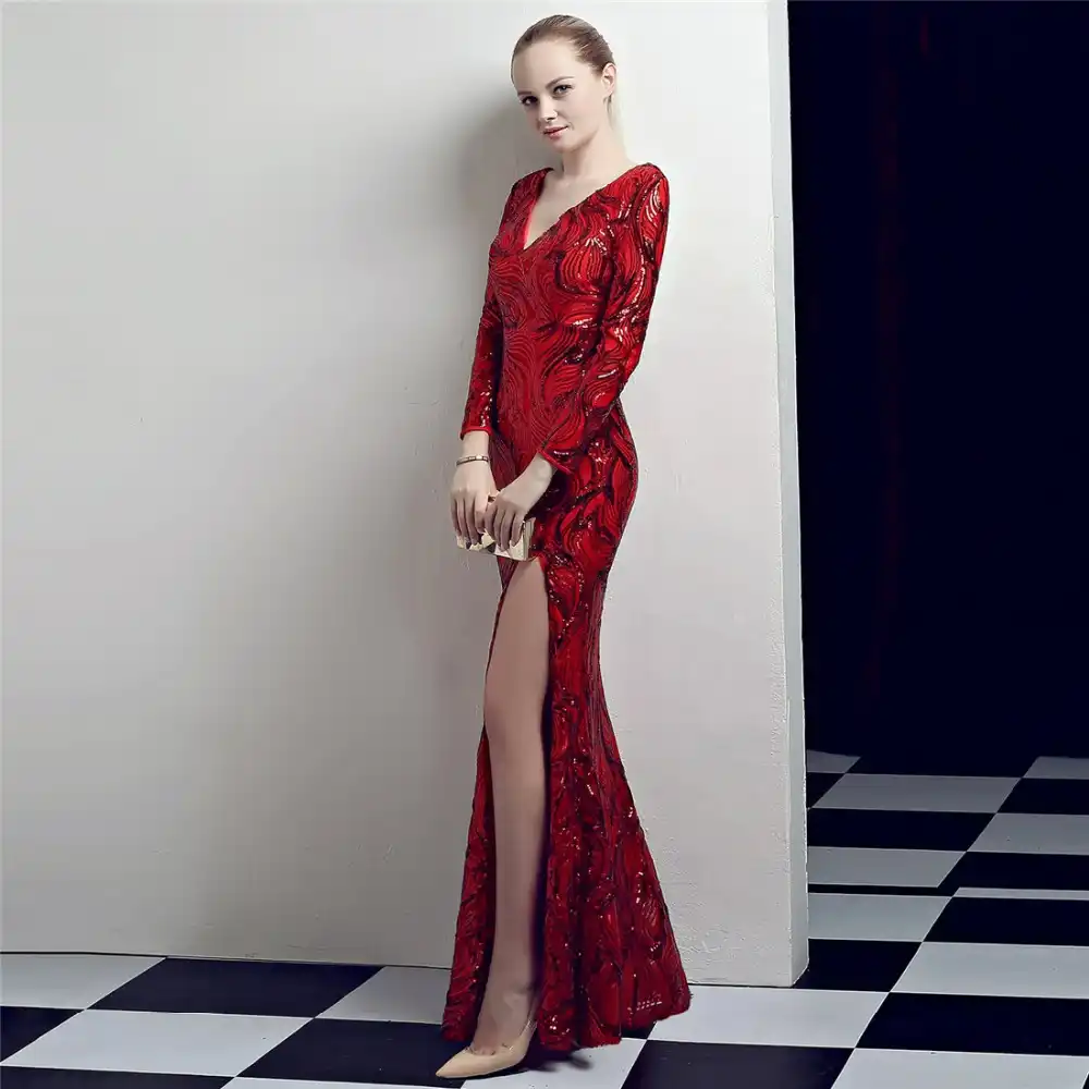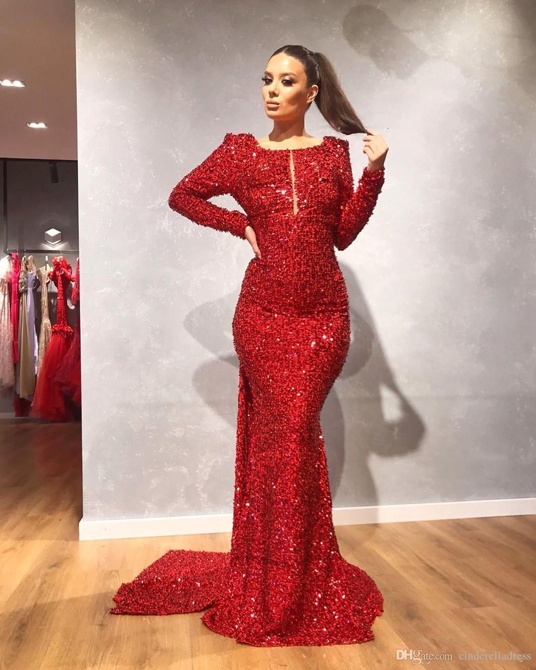 Glittler Gold Long Sleeve Mermaid Evening Dresses Red Sequined