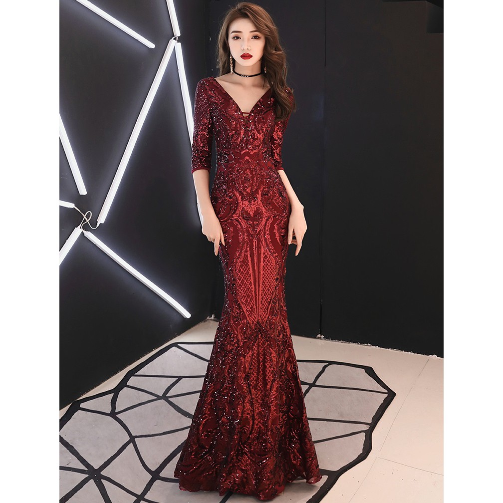 Weiyin 2020 Wine Red Black Gold Sequins Mermaid Evening Dress Long